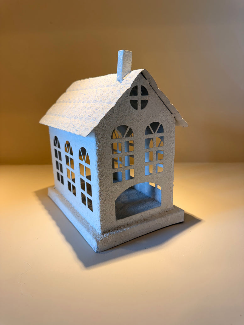 Ilumina tu Navidad con la delicadeza de la Casita de Lámina Blanca. Su diseño minimalista y acogedor, en acabado metálico blanco, la convierte en una pieza versátil para decorar repisas, mesas auxiliares o centros de mesa. Puedes colocarle dentro una vela LED o lucecitas para darle un brillo cálido y mágico durante las fiestas.