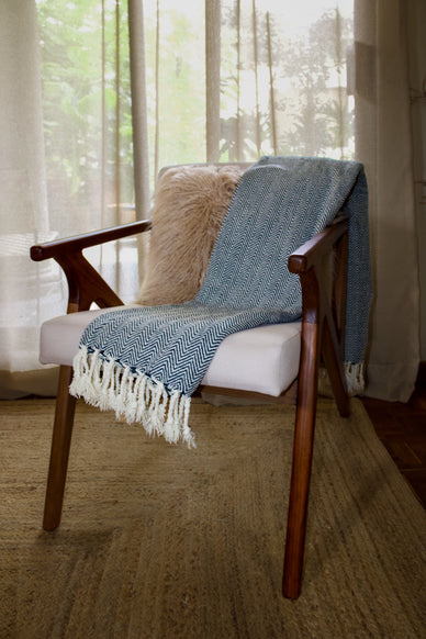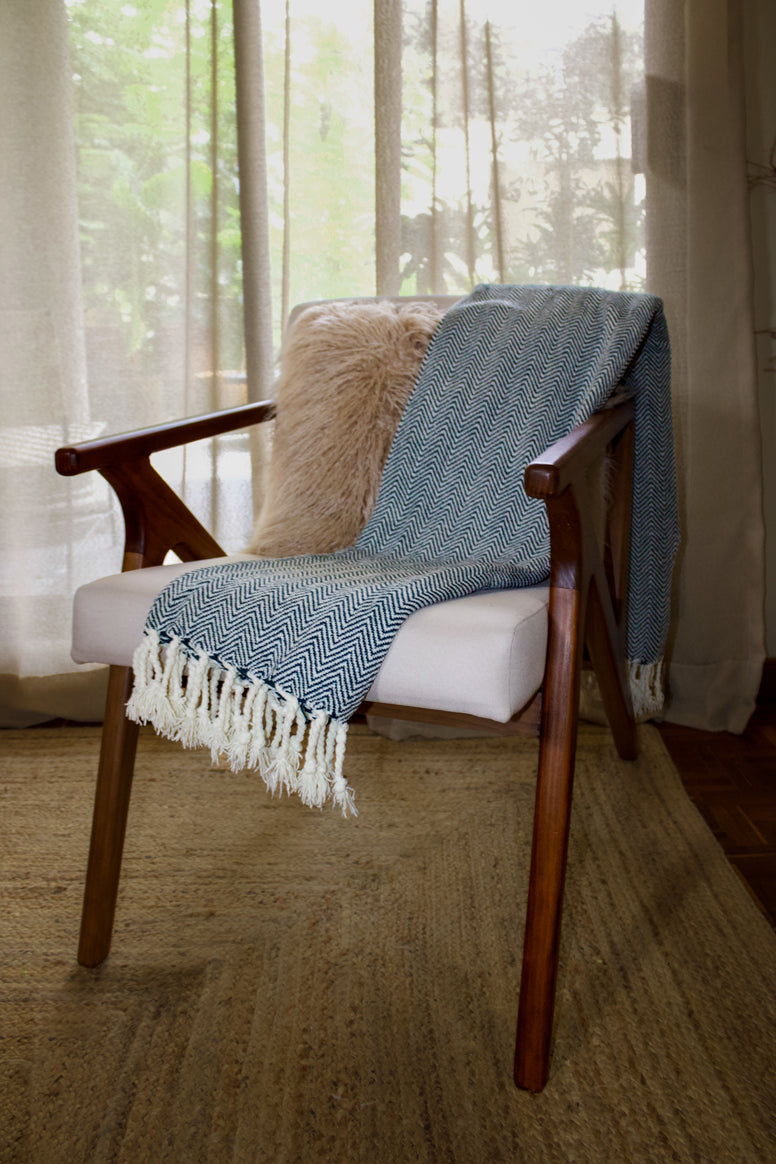La Cobija Cherion Blue destaca por su diseño en tejido espiga azul con blanco, que combina frescura y estilo artesanal. Su textura suave y ligera la hace perfecta para acurrucarte en cualquier momento, mientras que los flecos decorativos añaden un toque bohemio y elegante. Ideal para decorar tu sala, recámara o terraza, aportando calidez y un acento decorativo único a tus espacios.