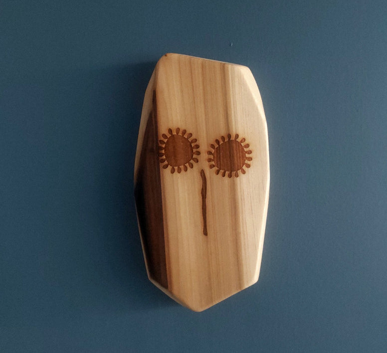 Máscara artesanal tallada en madera de poplar con acabado natural y vetas visibles que hacen única a cada pieza. Su diseño minimalista con grabados geométricos evoca una expresión abstracta y elegante, ideal para decorar espacios contemporáneos, wabi-sabi o de inspiración natural.