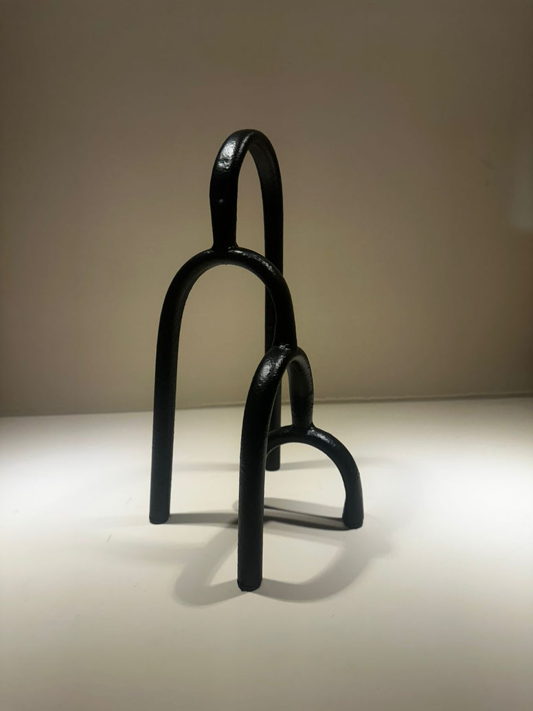 La Estructura Decorativa Negra de Metal es una pieza moderna y escultórica que combina formas entrelazadas entre aros y un nudo, creando un diseño abstracto y lleno de movimiento.