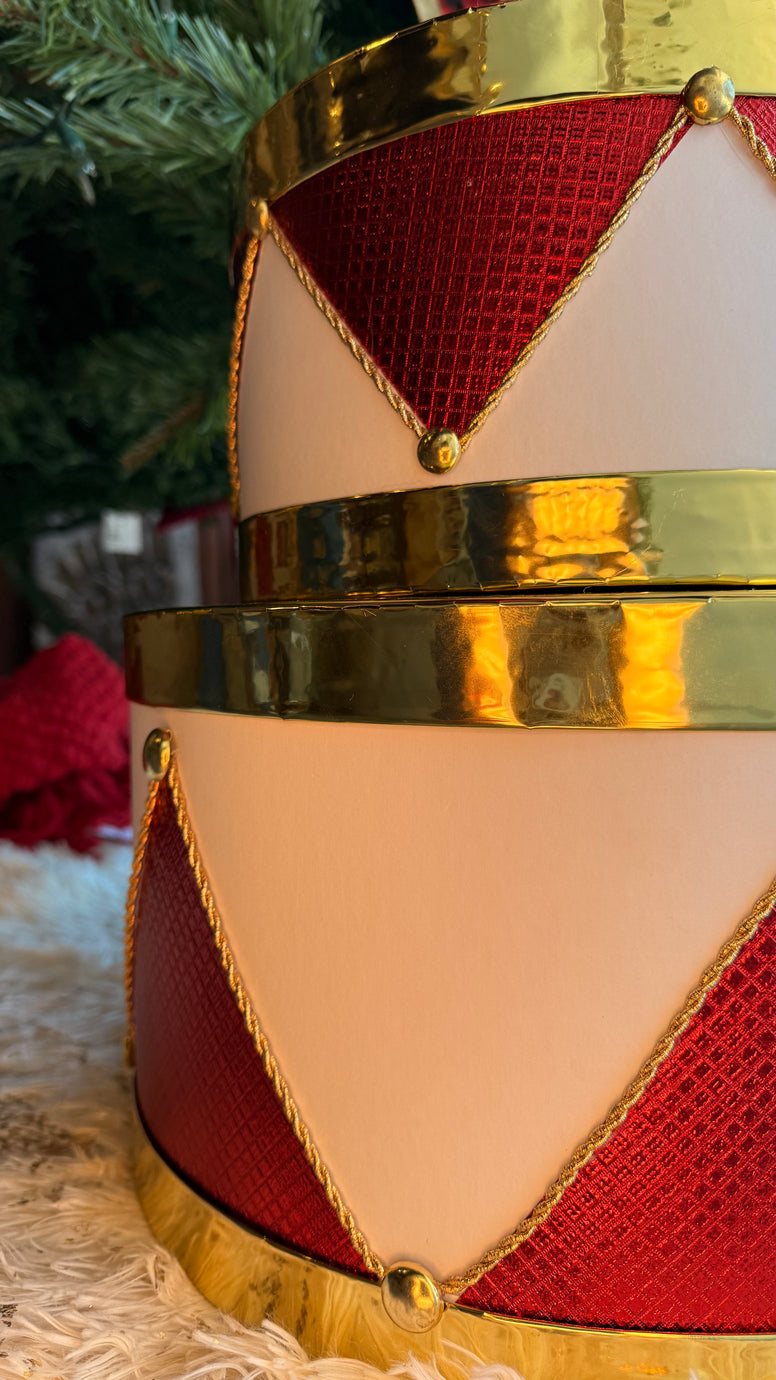 Dale un toque clásico y brillante a tu árbol con el Tambor Triángulo Rojo. Su forma triangular tipo tambor y el acabado rojo intenso, realzado con detalles metálicos dorados, lo convierten en un acento elegante para la temporada. Es ligero, fácil de colgar y perfecto para combinar con esferas, listones y luces cálidas. Disponible en dos tamaños (chico y grande) para crear profundidad visual en tu decoración navideña.